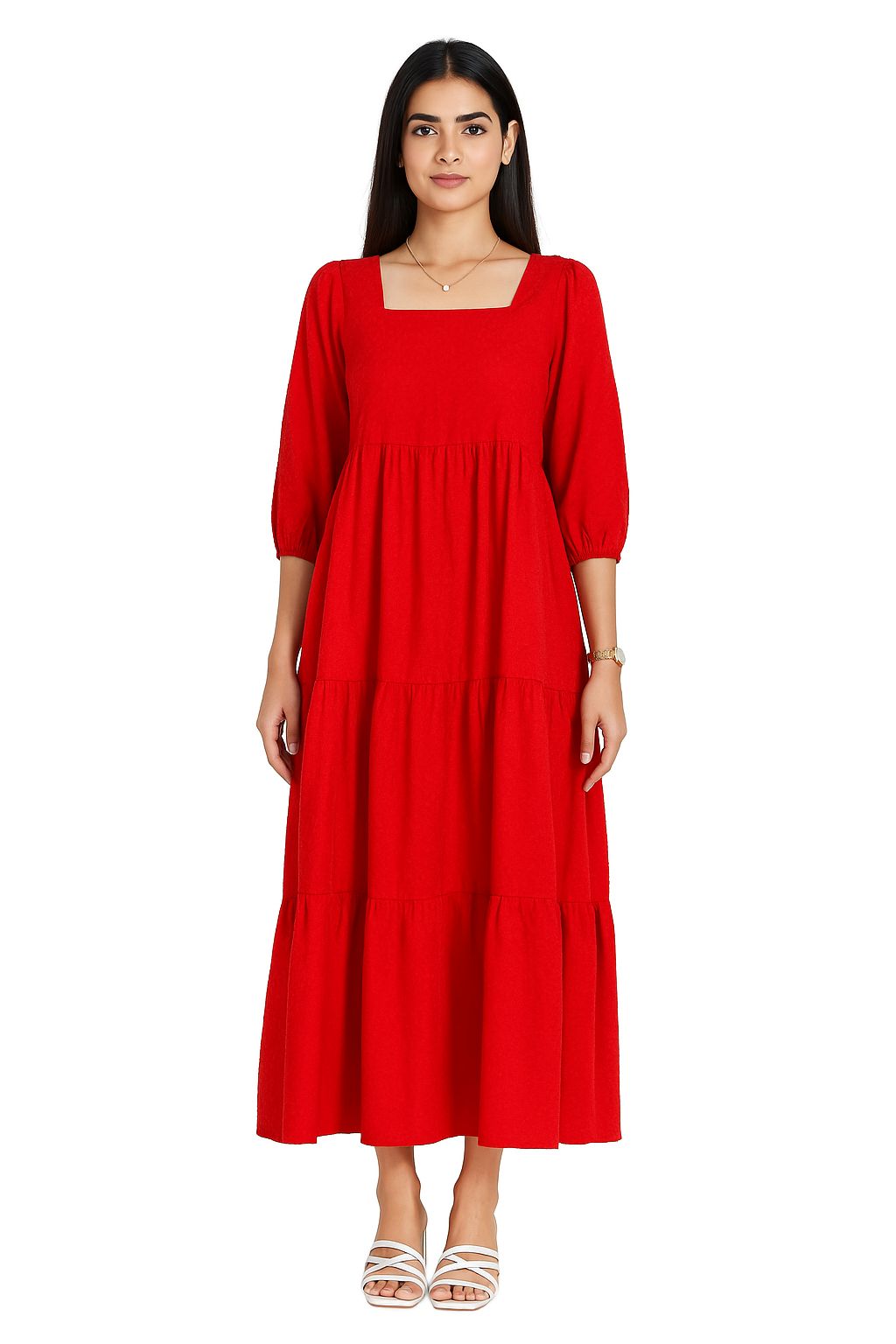 Add a pop of vibrant elegance with our Red Bloom Cotton Frock. Designed with chic puffy sleeves and tailored in breathable cotton, this frock blends comfort with style effortlessly. The bold red hue makes it a standout choice for casual gatherings, festive occasions, or evening outings. Its flattering cut ensures a graceful silhouette, making it a timeless wardrobe essential.